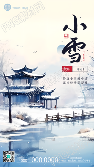 动漫风格雪中民宿美景小雪节气宣传手机海报