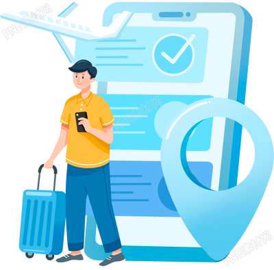 手绘扁平男生导航旅游飞机票预订行李箱热气球矢量图片素材