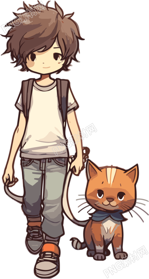带领猫咪的卡通男孩穿着短袖素材
